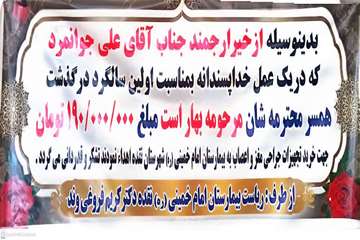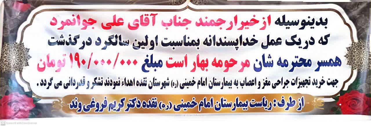 به اطلاع میرساند، جناب آقای حاج قربانعلی جوانمرد، همسر گرامی مرحومه بهار است، مبلغ ۱۹۰ میلیون تومان، به مناسبت اولین سالگرد آن مرحومه، جهت خرید تجهیزات جراحی مغز و اعصاب، به بیمارستان امام خمینی(ره) اهدا نموده تا به جمع خیرین عرصه سلامت شهرستان نقده بپیوندد.